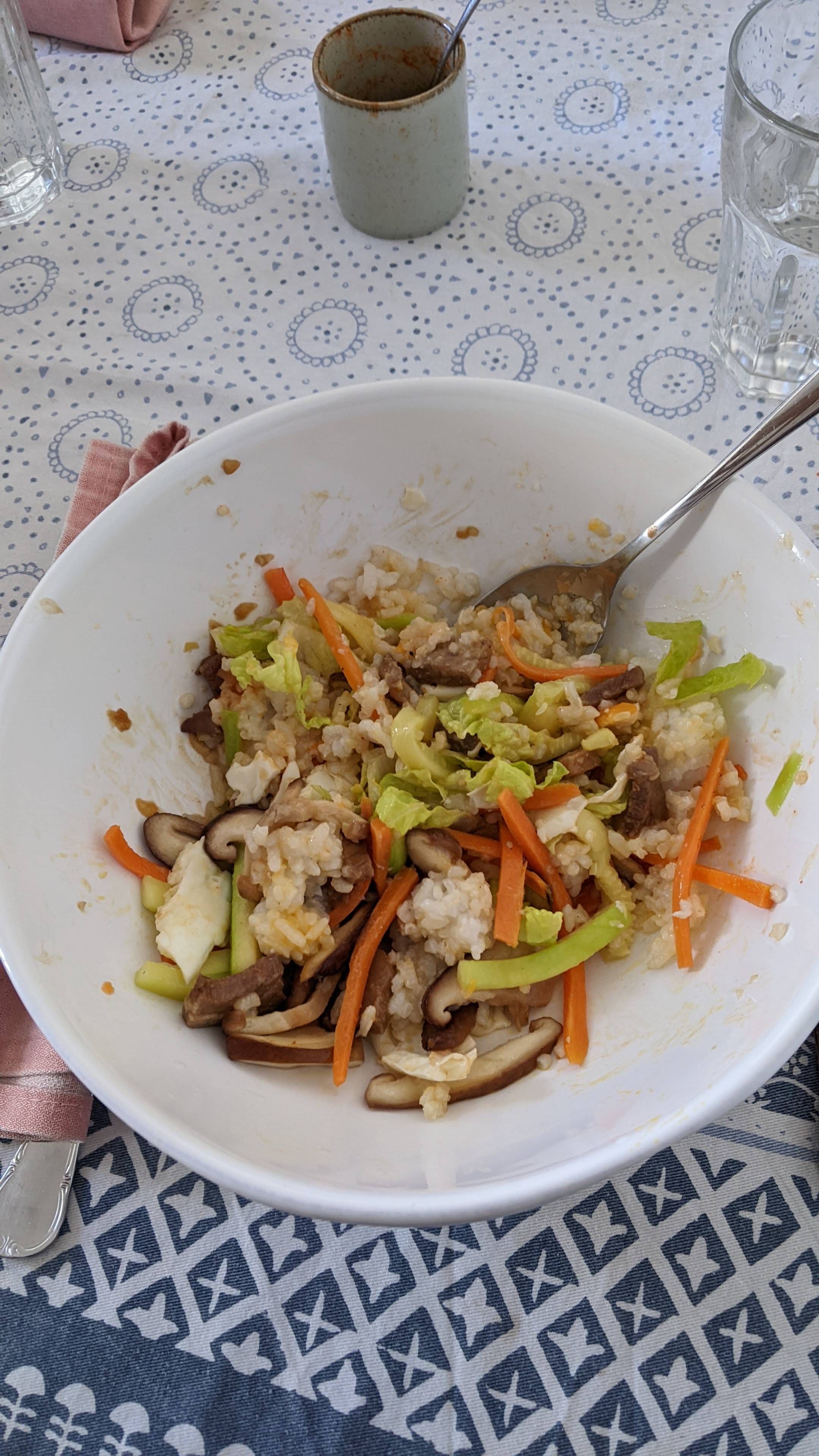 - Se cortan todas las verduritas a tiras finas y se fríe a fuego alto la zanahora, el calabacín y las setas (yo le pongo shitake si tengo, pero con champis también vale).